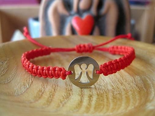 Náramok je pletený z tenkých šnúrok a nerezového komponentu anjelika platinovej farby, ktorý je ochranným symbolom. Zosilnenou ochranou je červená farba šnúrky. Môžem však vyhotoviť v akejkoľvek farbe. Nerez nehrdzavie, nečernie, je vodeodolná a nespôsobuje alergiu.