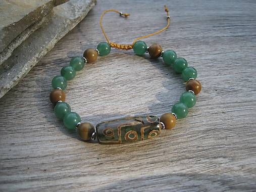 Náramok je zhotovený z korálok drevitého jaspisu a veľkej achátovej korálky DZI, navlečených na šnúrku. Zaťahuje sa za šnúrky.